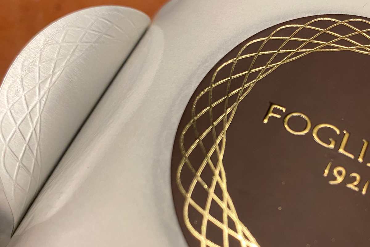 The relief stamp is followed by hot stamp with glossy or matte foils.
